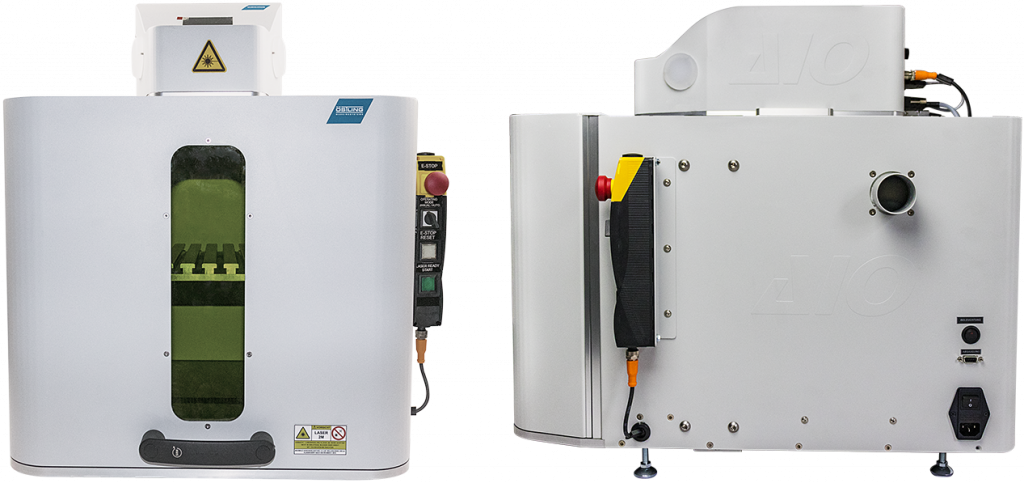 Die AIOBox ist eine „Plug and Play“ – Laserstation. Sie kann einfach via USB oder Netzwerkkabel (LAN) mit einem PC verbunden werden und ist sofort einsatzbereit. Die sehr einfache Inbetriebnahme und die bequeme Bestückung machen die AIOBox zu einem Komfortmodell. Trotz der kompakten Bauweise verfügt die AIOBox über ein außergewöhnlich großes Ladevolumen. Abhängig von der verwendeten Linse kann eine Markierfläche von bis zu 200 x 200 mm genutzt werden.